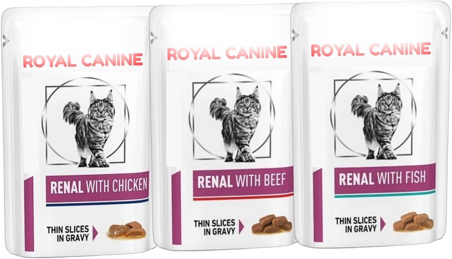 The Royal Canin Renal Cat Food Wet Veterinary is a 3-box set of wet cat food designed to support kidney health in adult cats. Each box contains 12 pouches of 85g each, with flavors such as chicken, beef, and tuna. This food helps support a balanced digestive-renal system and renal function thanks to its low phosphorus content.
